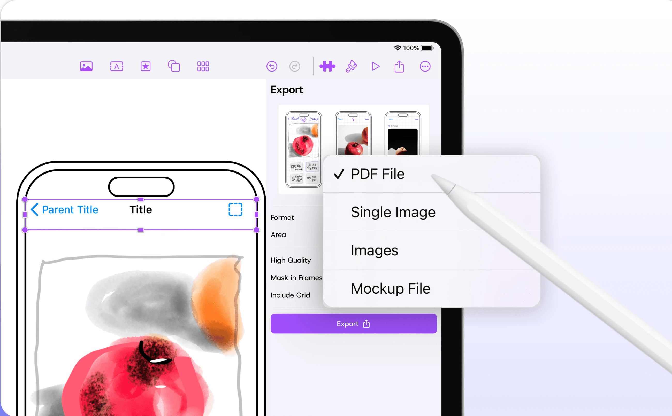 Whether you're sending your work to others, transferring your vision into another app, or finalizing your blueprint, you can export as PDF or PNG files, or share Mockup files with other users.